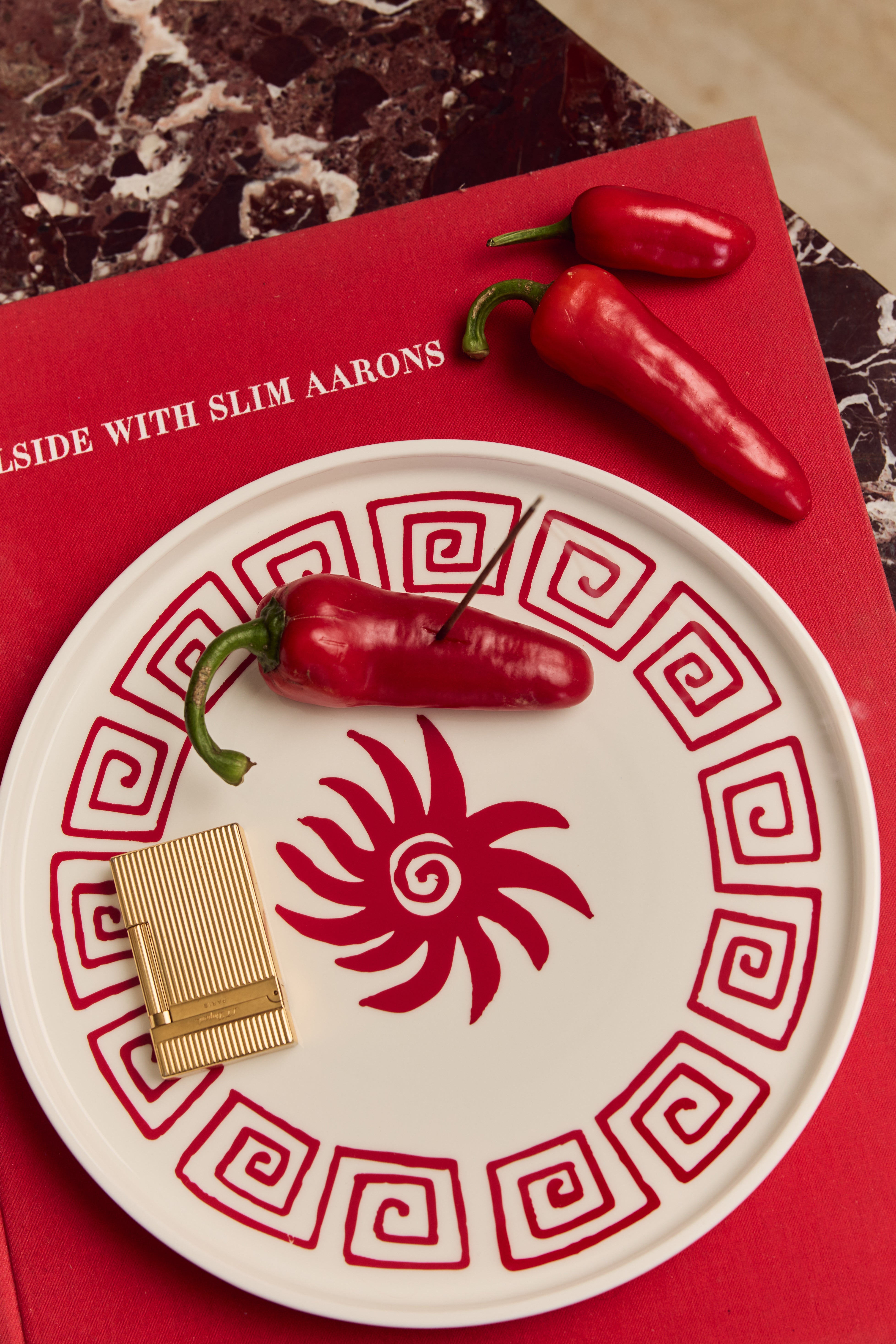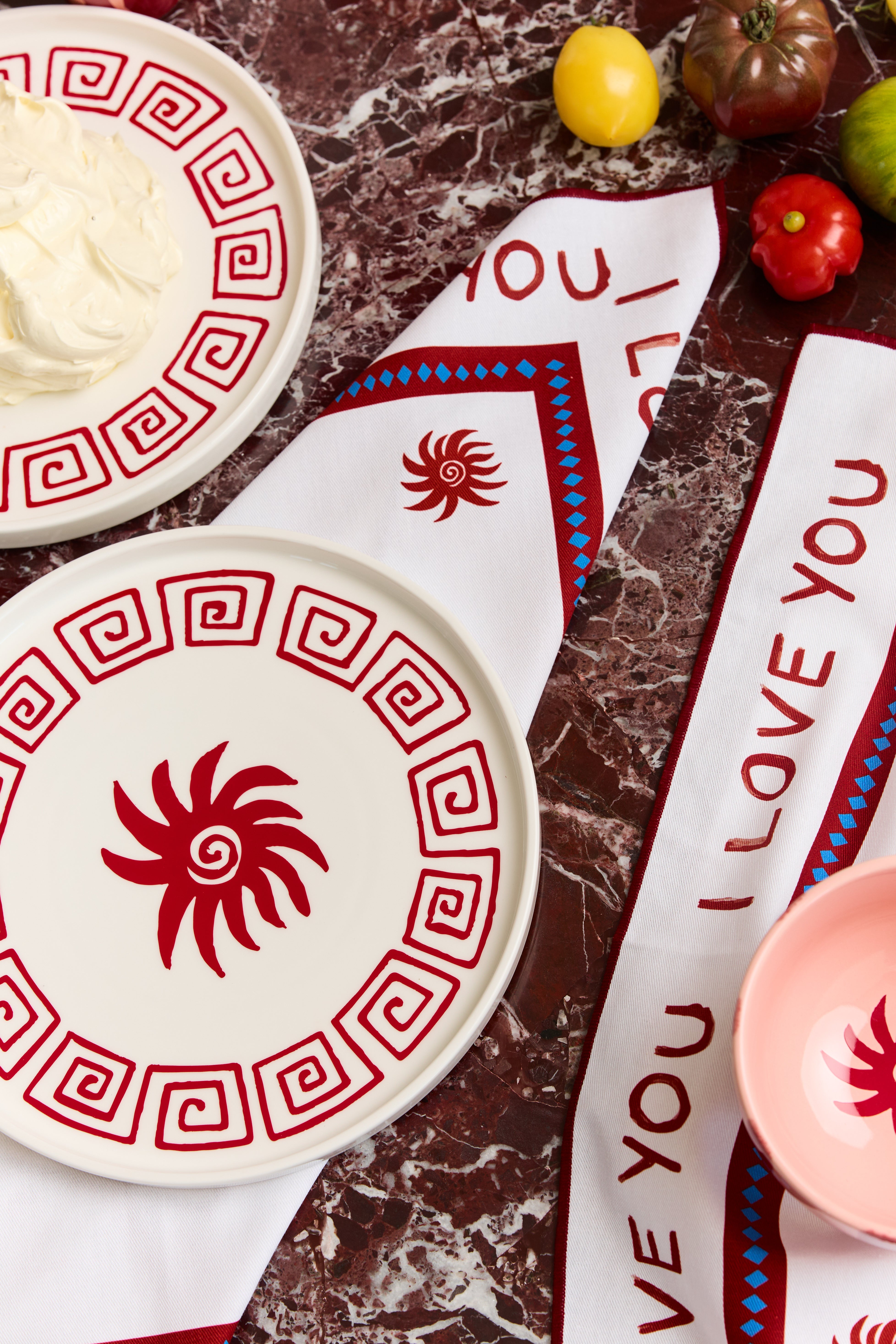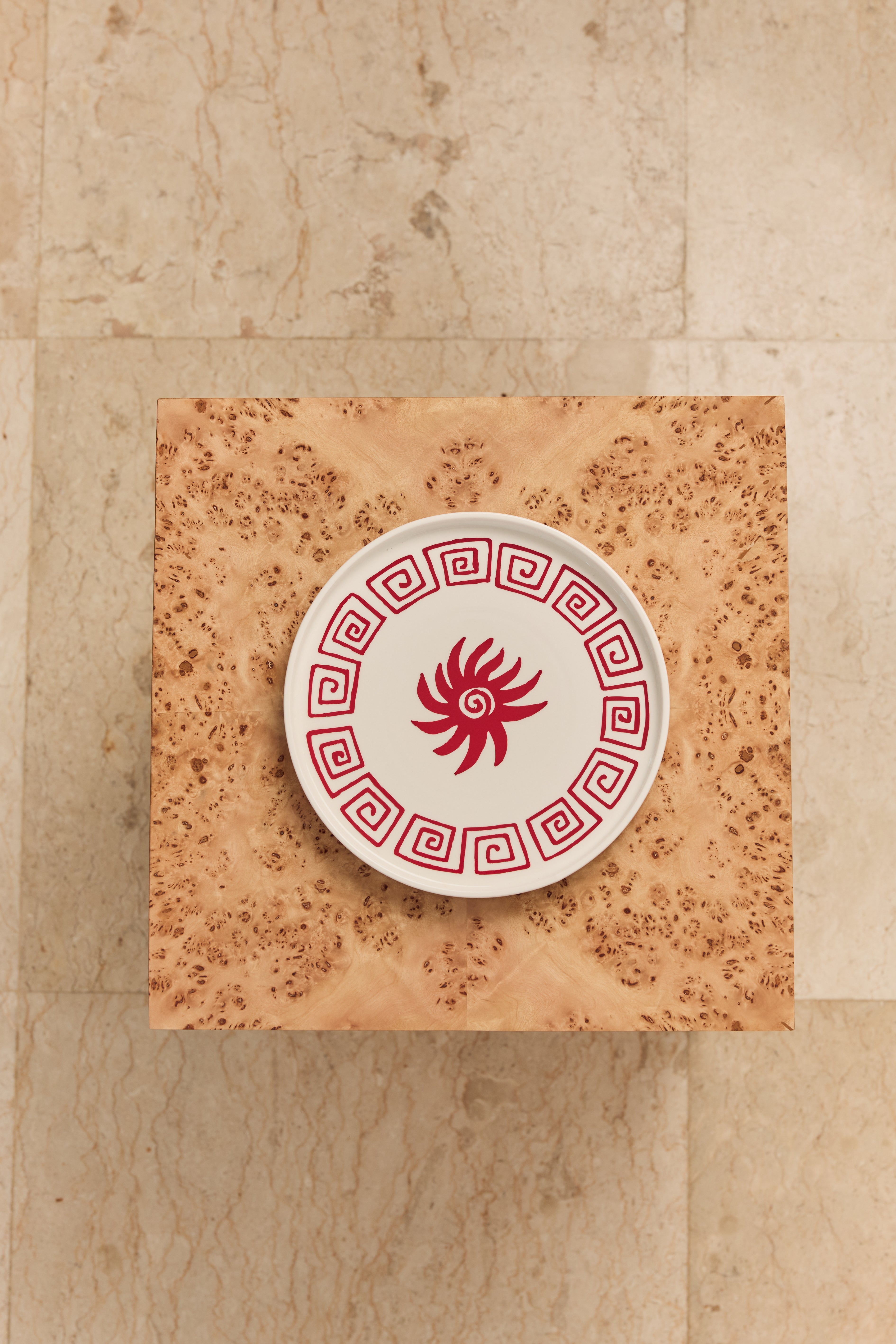 The Suki Plate offers a graphic, striking take on the collection's signature motifs. Rendered in the collection's signature burgundy, Peppa Hart's sun radiates from the centre framed by the Greek key pattern around the rim. The design feels both timeless and modern, a testament to the heartfelt journey that brought this collection to life.