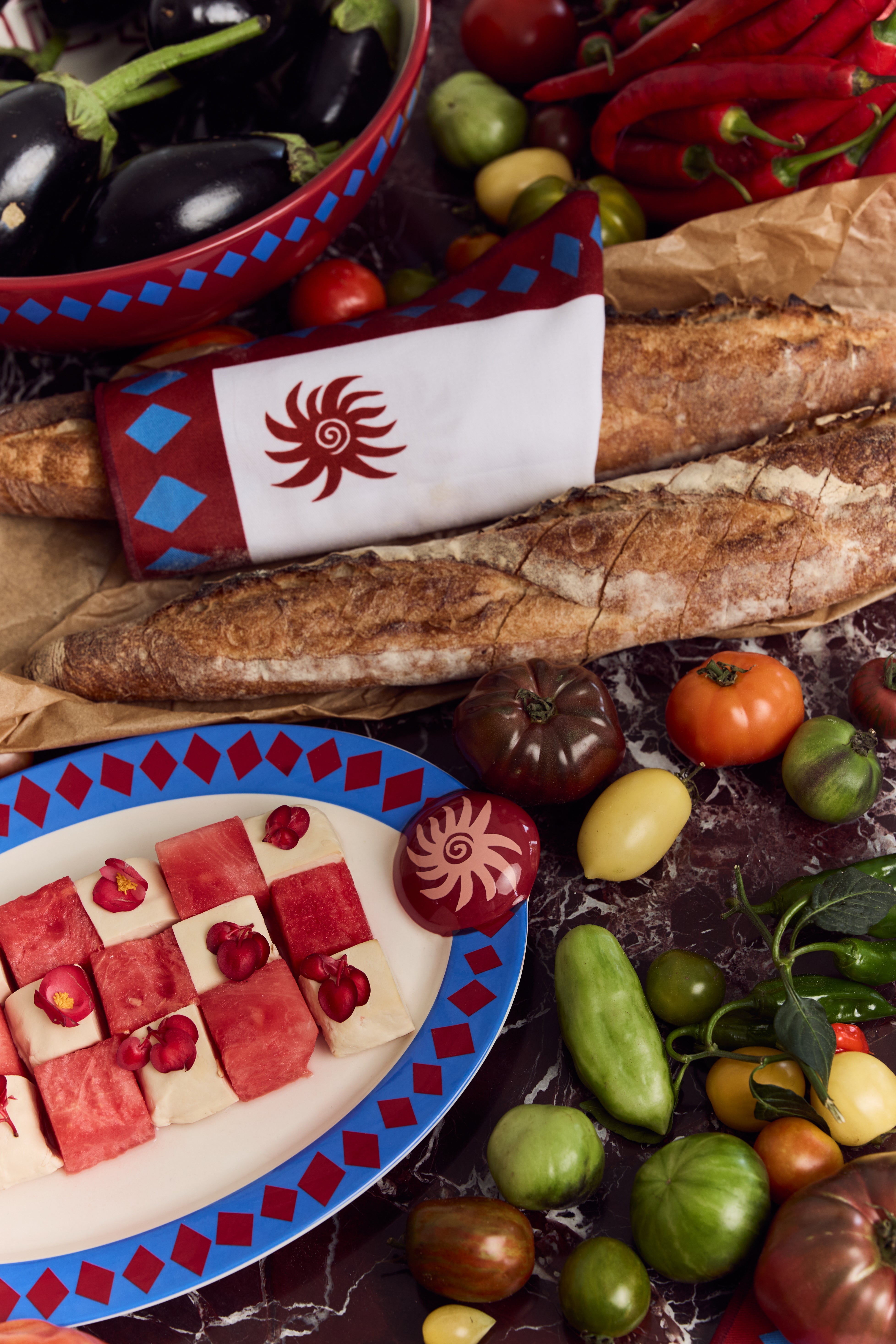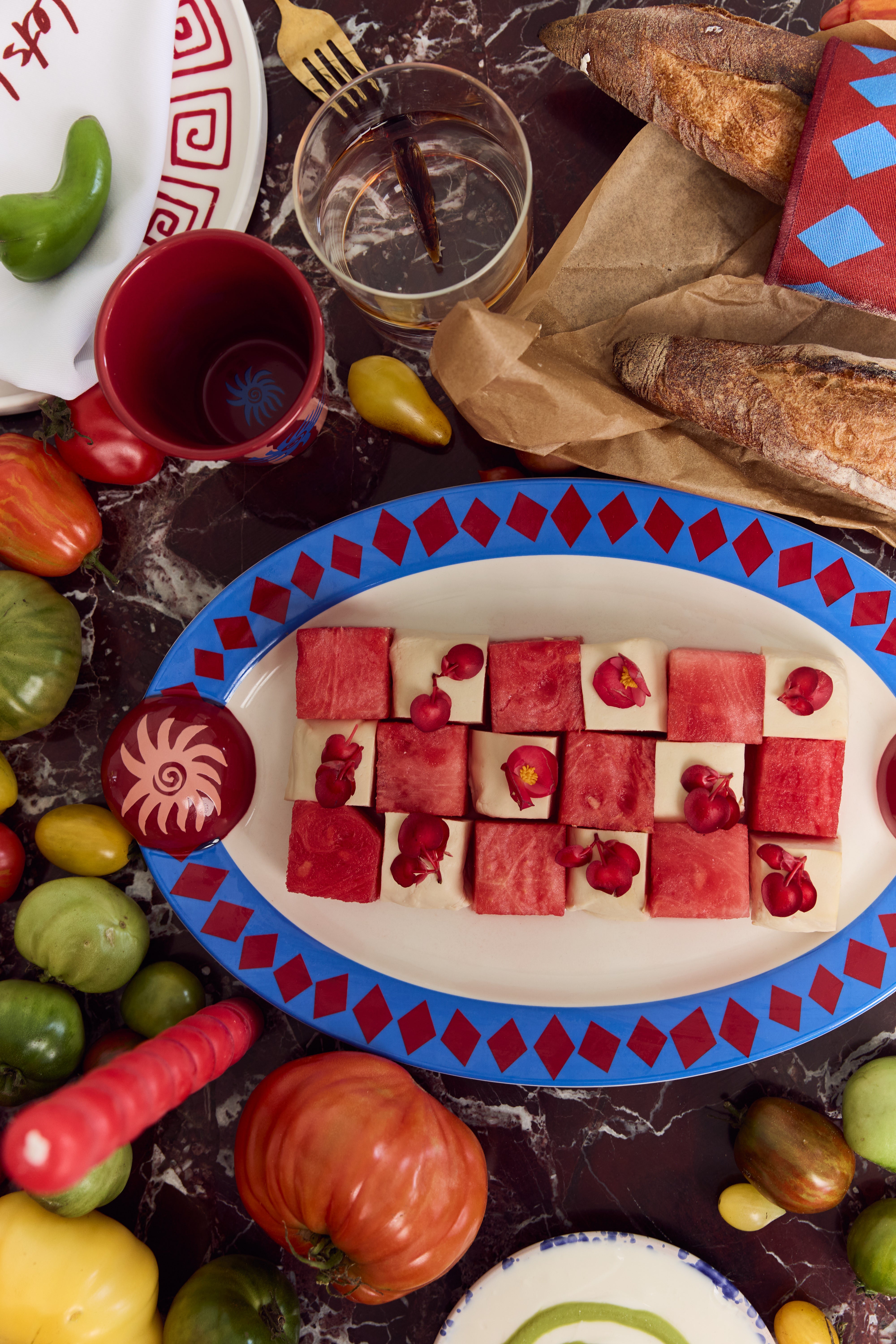 The Coco Platter is designed to make a statement. Its elegant oval shape is framed by a bold, diamond pattern in vivid blue and red, bringing a playful yet sophisticated energy to your table. The design is made truly unique by two sculpted handles on either end, each bearing the collection's signature sun motif that connects it beautifully to other pieces like the Paloma Bowl.