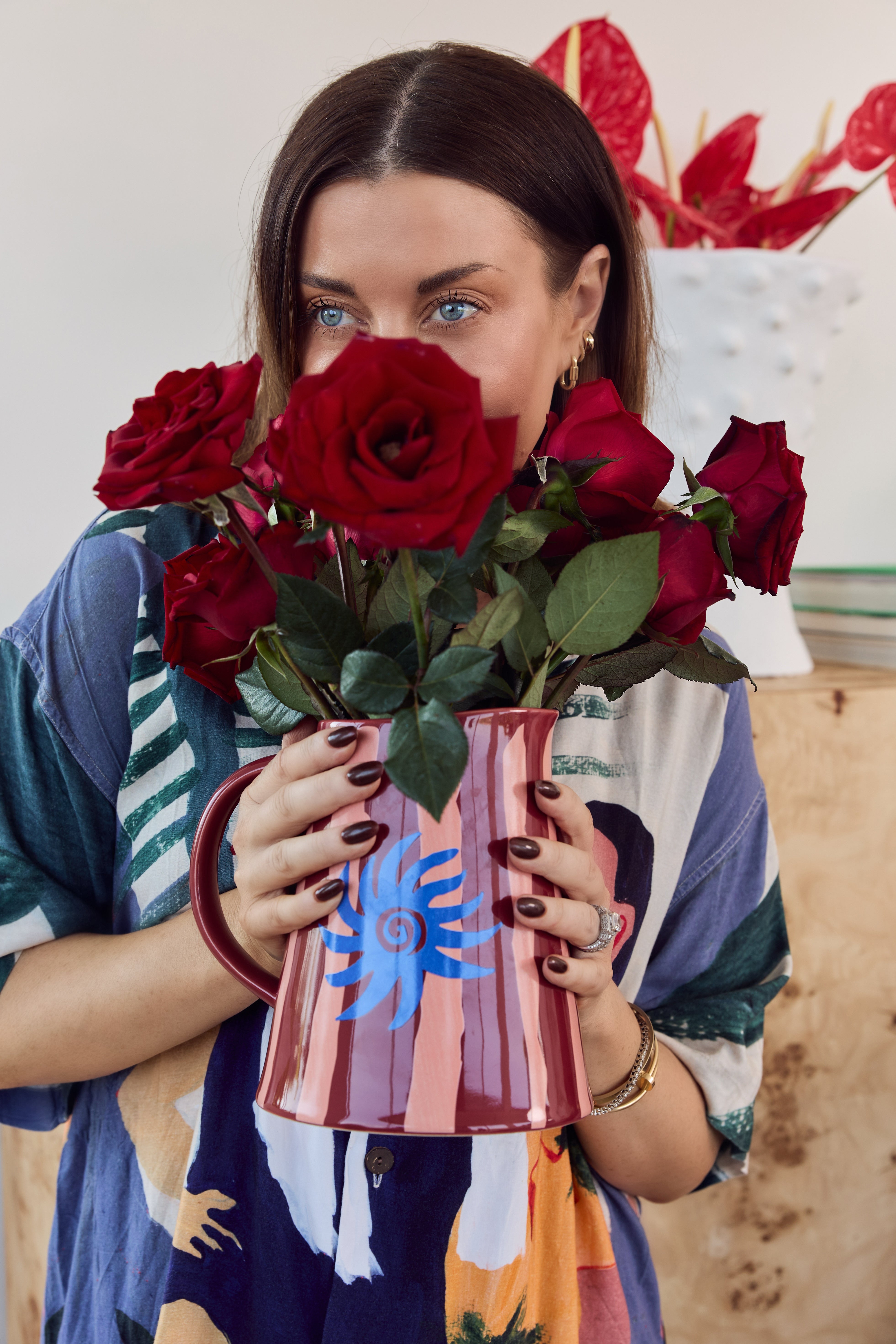 With its distinctive, sculptural shape, the Solae Jug is immediately captivating. A rich, glossy burgundy base is adorned with organic stripes in a soft, earthy blush. But the true magic happens when this warm palette collides with Peppa Hart's sun in electric cobalt blue. This playful contrast captures the very essence of the collaboration: two worlds meeting to create something beautiful and new.
